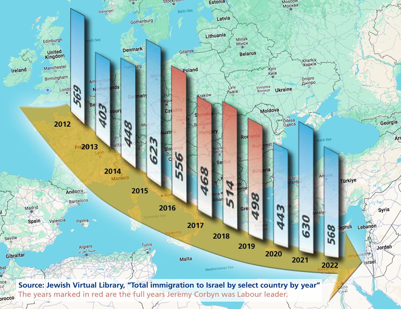 In the four full years of Corbyn’s leadership the average number of Jews emigrating to Israel each year was 509.