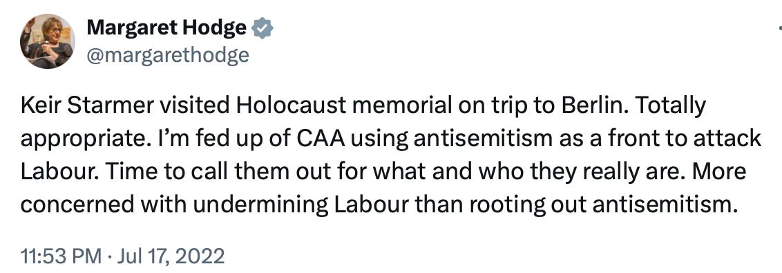 When the CAA accused Keir Starmer of using the Holocaust memorial in Berlin as a prop for a political ad in July 2022, it was a step too far for former honorary patron Margaret Hodge.