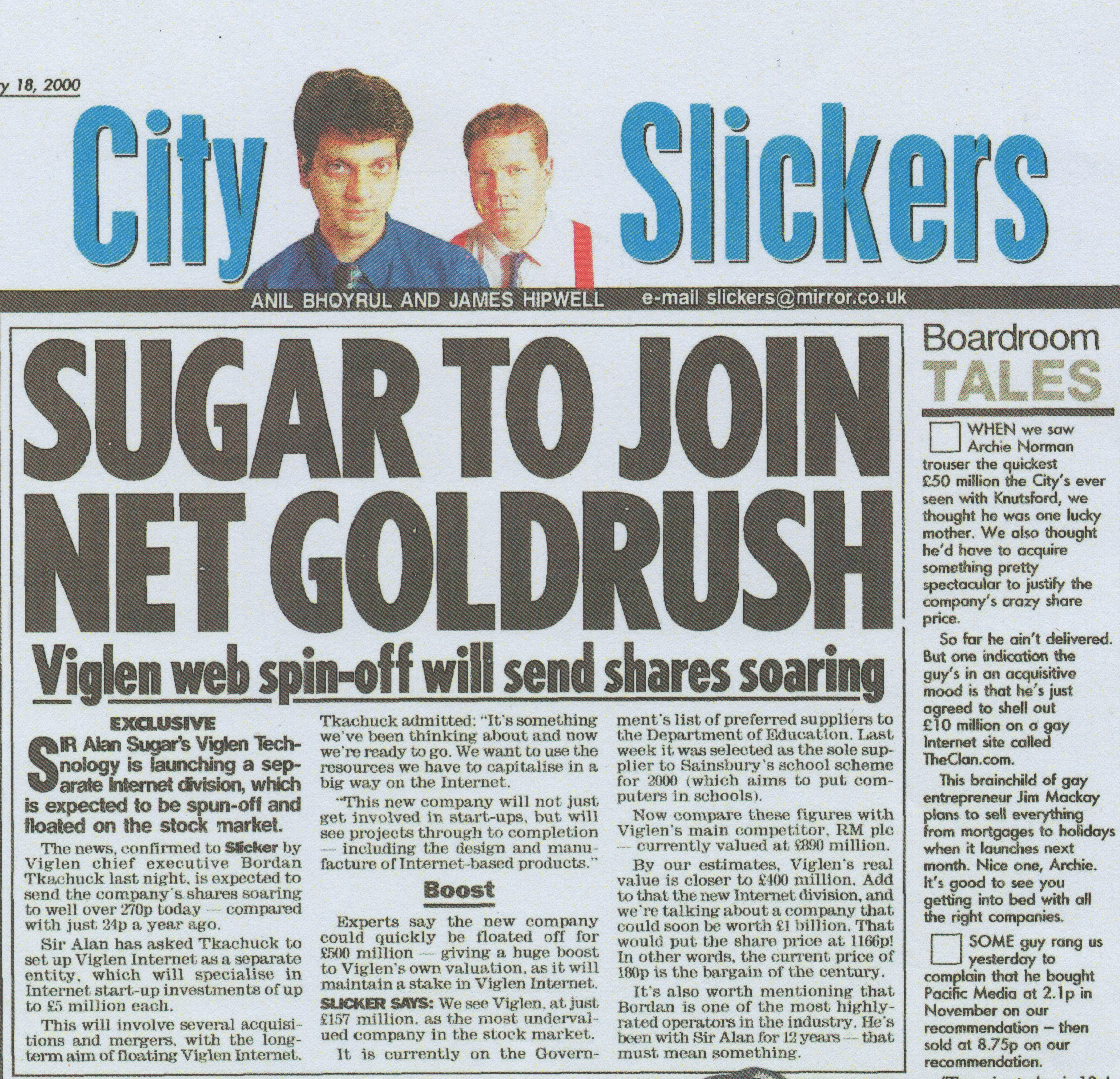 It was also the day the Daily Mirror business column, City Slickers, were preparing an exclusive story about Viglen starting an internet business.